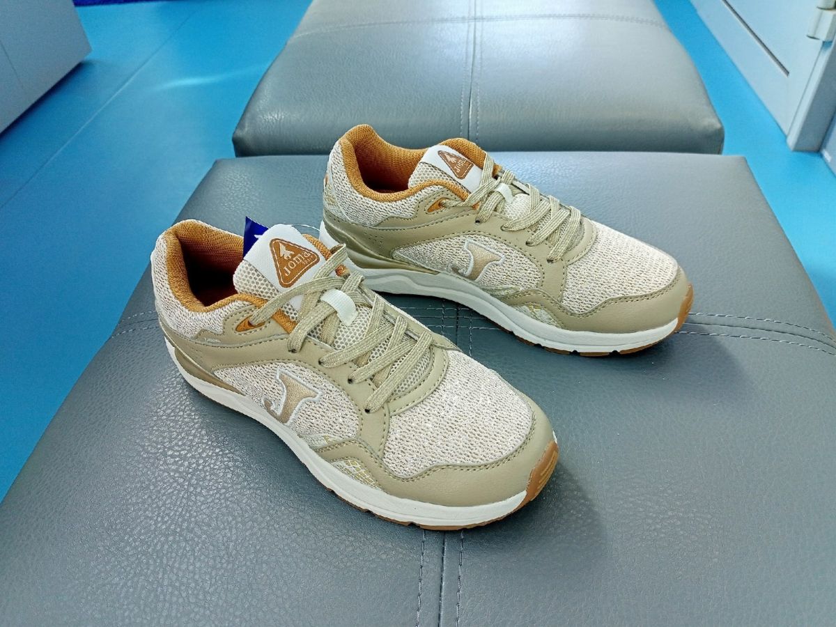 Крой выполнен из нейлона и кожи. Верх — текстиль с золотистым рюлексом. Резиновая подошва.